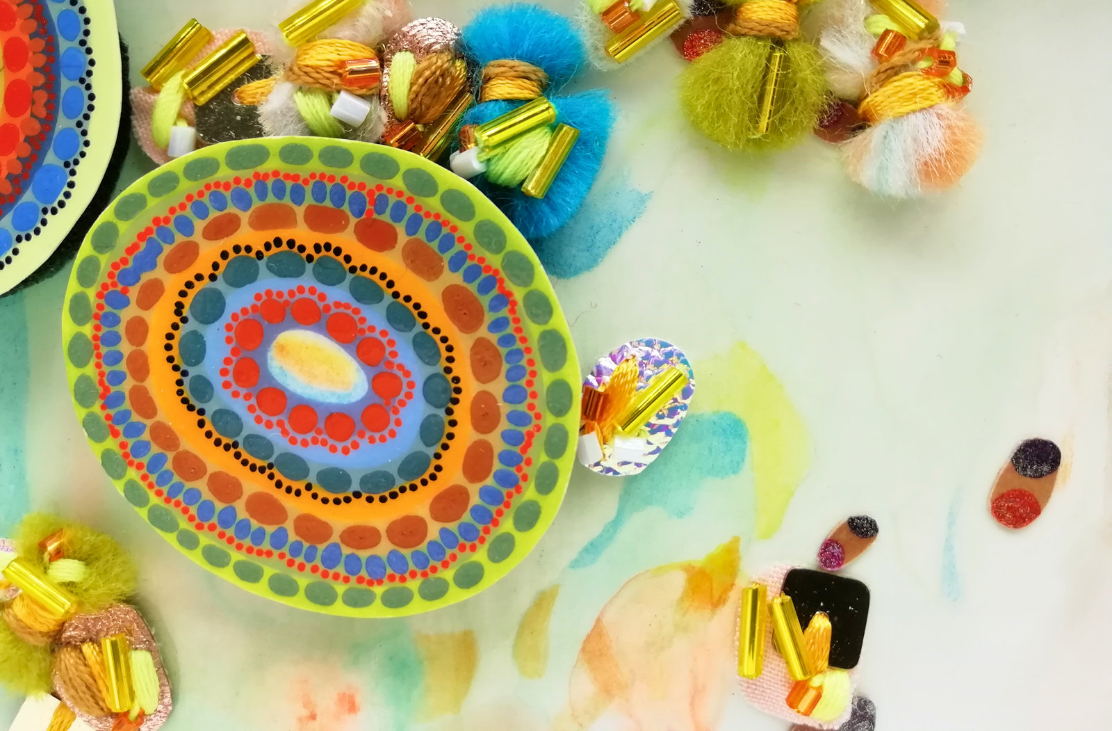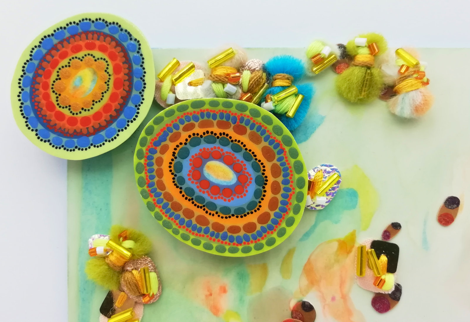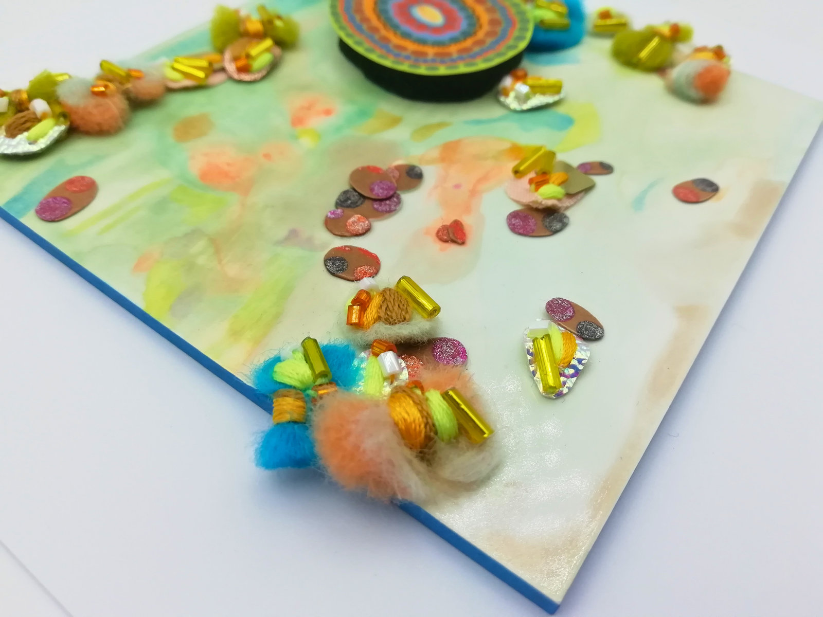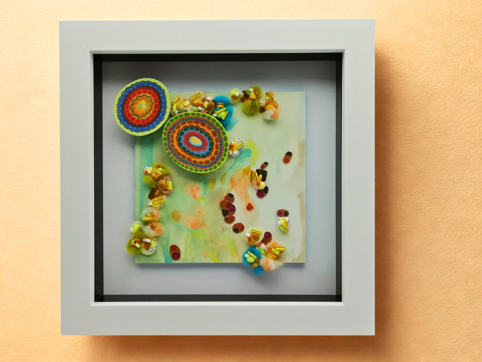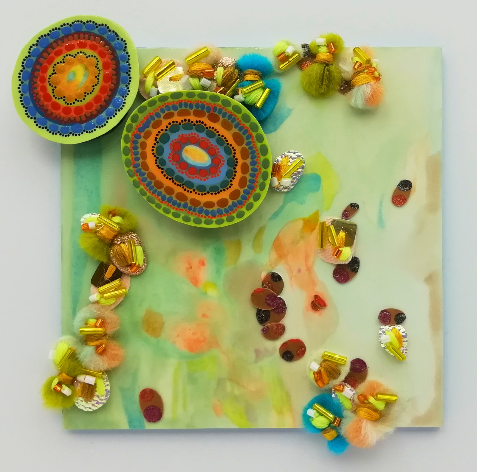 A bit more of a dreamy artwork from the Razzle Dazzle collection has just landed in my Etsy Shop. These blue, orangey and green colours, and the gentle tones coming through on the painted background remind me of swimming through a beautiful ocean. I hope you like it as much as I enjoyed painting and making it. There's some Merino wool amongst other fabrics in this one, with beads sewn through... reminiscent of ocean treasures, perhaps.